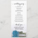 Ce magnifique programme de mariage présente un design élégant avec une seule longue tige turquoise, bleu ciel ou azur rose couché sur son côté réfléchissant dans l'eau. Les titres sont écrits en calligraphie de script sophistiquée, et il y a de l'espace pour vos détails de cérémonie et de mariage, ainsi qu'un bref merci pour vos invités. Merveilleuse façon d'accueillir vos amis et votre famille à votre fête mariage.
