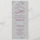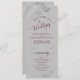 Ce magnifique programme de mariage présente un design élégant avec cassis violet ou texte magenta sur un arrière - plan gris et lacy gris boucles et tourbillons dans les coins. Les titres sont écrits en calligraphie de script sophistiquée, et il y a de l'espace pour vos détails de cérémonie et de mariage, ainsi qu'un bref merci pour votre invité. Merveilleuse façon d'accueillir vos amis et votre famille à votre fête mariage.