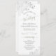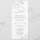 Ce magnifique programme de mariage présente un design élégant avec du texte vert sauge et gris sur un arrière - plan blanc et en dentelle gris argent boucles et tourbillons dans les coins. Les titres sont écrits en calligraphie de script sophistiquée, et il y a de l'espace pour vos détails de cérémonie et de mariage, ainsi qu'un bref merci pour vos invités. Merveilleuse façon d'accueillir vos amis et votre famille à votre fête mariage.