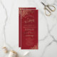 Ce magnifique programme de mariage présente un design élégant avec du texte doré sur un arrière - plan rouge crimson et des boucles et tourbillons en faux feuille doré en dentelle dans les coins. Les titres sont écrits en calligraphie de script sophistiquée, et il y a de l'espace pour vos détails de cérémonie et de mariage, ainsi qu'un bref merci pour vos invités. Merveilleuse façon d'accueillir vos amis et votre famille à votre fête mariage.