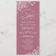 Ce magnifique programme de mariage présente un design élégant avec du texte blanc sur un rose ou un arrière - plan rose mauve poussiéreux et des boucles et tourbillons blancs en dentelle dans les coins. Les titres sont écrits en calligraphie de script sophistiquée, et il y a de l'espace pour vos détails de cérémonie et de mariage, ainsi qu'un bref merci pour vos invités. Merveilleuse façon d'accueillir vos amis et votre famille à votre fête mariage.