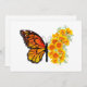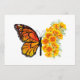 Orange, detailed monarch butterfly with wing decorated with yellow, vibrant California poppy on white background.