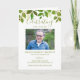 Le programme de célébration de la vie qui figure sur la couverture d'une photo de la personne de votre être aimé, des dates, le lieu de commémoration, la date de l'événement, et l'élégant feuillage d'aquarelle verte. À l'intérieur se trouve une nécrologie et un ordre de service; et à l'arrière une note de remerciement et le deuxième lieu pour après les funérailles.