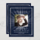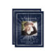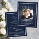 Un programme élégant de 2 pages. Un arrière - plan bleu foncé, un cadre faux argenté et un espace pour une photo. Poutres lumineuses derrière la photo. Personnalisez et ajoutez le nom, les dates et votre texte.