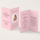 Un programme élégant de 4 pages. Un arrière - plan rose ceinturon. Personnalisez et ajoutez une photo, un nom, des dates et votre texte. Des rayons de lumière blanche derrière la photo.