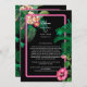 Une botanique tropicale néon rose moderne et rétro sur un arrière - plan noir. Un beau design mariage idéal pour l'été. Design plante tropical néon rose parfait avec palmiers, fleurs d'Hibiscus roses et fleurs de Plumerias Frangipanis. Les couleurs noir, rose et vert dominent ce néon rose tropical. La typographie calligraphique moderne contraste parfaitement avec le design mariage noir et rose. Un design élégant et élégant de carte de programme de mariage avec des éléments simples et modernes. Des articles de papeterie mariage correspondants et d'autres formats d'invitation de mariage sont également disponibles.