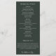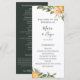 Élégant chic rustique verger d'agrumes botanique verdure, programme de mariage. Texte du modèle de liste pour l'ordre des événements de la cérémonie, cortège de mariage et note de remerciement. La couleur de fond montrée en vert chasseur foncé coordonnant, peut être personnalisée.