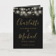 Programme de mariage de script noir et or avec de jolies lampes à cordes et une typographie moderne chic. Ce programme de mariage élégant peut être personnalisé avec vos informations spéciales de jour de mariage. Conçu par Thisisnotme©