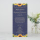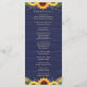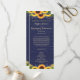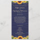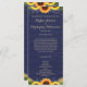 Ce décor rustique de campagne comprend des lampes à cordes d'or et de la dentelle ainsi que des tournesols et des sprigs de lavande contre un arrière - plan en bois de grange bleu marine. Le texte, avec des noms de mariée et de mariée personnalisables et des détails de l'événement, apparaît en or pâle dans le script populaire et la typographie serif. Vous pouvez personnaliser ce programme pour votre propre mariage en modifiant le texte du modèle.