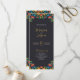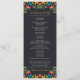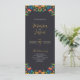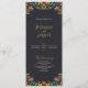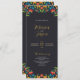Ce programme de mariage floral coloré de fleurs botaniques mexicaines présente une bordure florale symétrique contre un arrière - plan noir de charbon profond, créant un contraste audacieux et élégant. Les bords supérieur et inférieur présentent des fleurs jaunes, rouges, oranges et bleues éclatantes, aux feuilles verts luxuriants, accentuées par de petites baies rouges, ce qui ajoute un intérêt visuel. L'espace central vide et large offre un espace propre, parfait pour ajouter du texte ou des détails d'événement tout en gardant le cadre floral orné comme un élément décoratif frappant.