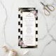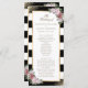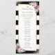 Élégant programme de mariage floral rayé noir et blanc avec fleurs roses et verdure encadrant les détails mariages à l'intérieur d'un cadre doré orné de confettis dorés contre un arrière - plan noir et blanc. Éléments correspondants disponibles.