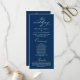 Modern Classy Elegant Wedding Ceremony Program card. It is designed with scroll accent that can be personalised with custom/ personalised text for your bridal party, ceremony details, memorial notes and thank you message, in navy blue.