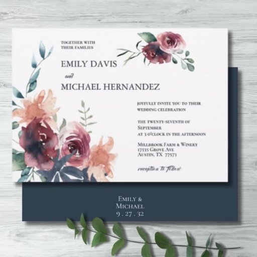 Éléments : aquarelle éléments floraux : roses, pivoines, eucalyptus verdoyant, feuillage. Polices serif aux accents de script vifs Couleurs : bordeaux, marron, marsala, framboise, mûre, rose, roussâtre, pêche, bleu poussiéreux, vert, bleu marine, bleu ardoise. Thèmes : moderne, fleurie, botanique, contemporain, chic, classique, jardin, simple, boho, pays, vignoble, cave. Collection : Collection moderne Floral Bourgogne Marine Peach Blush Mariage Collection. Type de produit : Programme