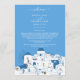 Une belle carte Itinéraire design avec illustration rustique de Santorin, églises à coupole bleue, Bougainvillea, plantes en terre cuite avec fond de mur blanc de l'île grecque. Destination élégante Santorin, design de mariage grec parfait pour Santorin et les mariages de style méditerranéen de l'île grecque. Le verso de la carte présente un monogramme minimaliste avec une église à dôme bleu. Des invitations de mariage et d'autres articles de papeterie sont également disponibles.
