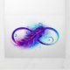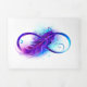 Symbole de l'infini avec une belle plume peinte en couleurs vives violettes et bleues sur fond blanc.