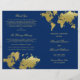 Une carte du monde luxueuse de style feuille d'or brille sur un fond bleu marine riche dans ce programme de cérémonie saisissant pour les couples voyageurs et les mariages à destination. "Cérémonie de mariage unissant" présente vos noms en écriture élégante sous la carte dorée, avec des accents d'éclaboussures dorées ajoutant une profondeur artistique. Les pages intérieures sont entièrement personnalisables pour votre cortège, l'ordre de la cérémonie et un message de remerciement personnel sur la couverture arrière. Les programmes sont imprimés sur du papier de poids texte et arrivent à plat, nécessitant un simple pliage au centre.