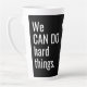 Promotional Latte Mug Business Logo No Minimum. We Can Do Hard Things Quote Business Logo Latte Mug. Stand out in a sea of coffee mugs with your tall latte mug! Personalized with your corporate company or small business or entreprenruial logo or for your team, sports team or nonprofit volunteer group. Modern white handlettering typography on black background. Perfect gift for your own teams or as a promotional marketing product or a gift for customers, clients or prospects. Inspirational quote on both sides. Your logo between them. Logo can be removed if you wish. Let them know your team CAN! Step by Step Inspiration Series available exclusively on Zazzle at zazzle.com/store/KrisHarty, designed by international designer, Kris Harty. © 2020 Kris Harty Step By Step Inspiration