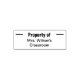 This is a stamp that teachers can use to identify property that belongs to their classroom. The top line says Property of and is in boldface type. The centre line is for the teacher's name. The bottom line says classroom.