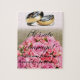 Puzzle of marriage proposal, with the text “Marry to you with me! (We will be happy and eat partridges…)” with branch of roses of pink color and alliances on bottom tone pie. An unforgettable surprise!