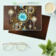 Turquoise lenses with antique watch with brass gears and golden keys on rusty, brown background. Steampunk style.