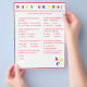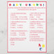 Le design comporte un arrière - plan blanc à une bordure rouge et un texte rouge. Le titre s'affiche dans des couleurs vives. Les questions sont des choix multiples et concernent le développement du bébé. La dernière question, cependant, est personnalisable et est personnalisée pour la Mommy-to-Be. Les lettres "ABC" sont affichées en bas, en coin droit dans les couleurs primaires. Les réponses se trouvent sur le dos. Conçu pour être coordonné avec la "collection de Baby showers ABC". Également disponible en bleu.