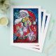 Peinture acrylique colorée, capricieuse et artistique, Père Noël joue du violon dans la nuit d'hiver enneigée, un hibou, ornements floraux, plantes d'hiver, baies sèches dans des couleurs rouge vif, vert, blanc, bleu, jaune.