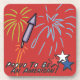 This design features three stars in red, blue and white. "proud to be an American" is printed on this design. A rocket with colourful fireworks are exploding through the skies. This image is available with a white, red or blue backround. Square or round coasters are available.
