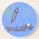 This design features three stars in red, blue and white. "proud to be an American" is printed on this design. A rocket with colourful fireworks are exploding through the skies. This image is available with a white, red or blue backround. Square or round coasters are available.