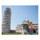 The famous Leaning Tower of Pisa stands prominently to the left, with an individual playfully posing in front of it, proud of being it's designer and builder