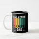 Proud Hockey Dad mug features several colours of green, off white, yellow, and rust orange on a black background with white text that reads I Am a Proud Hockey Dad!