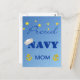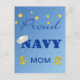 Proud Navy Mom Postcard - Features water drop background, a sailor hat and anchors.