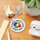 Keychain with white background with 4 multi-coloured puzzle pieces and words "Proud Parent of a child with autism" in black.