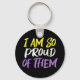 I am so proud of them keychain written in yellow, white, and purple on black for nonbinary parents. Show your pride for your non-binary child with the non binary colours for a mom or dad.