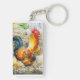 A barnyard rooster framed by a bevy of his lady hens and hay in soft focus around him. The gentle yellows and greys bring the colourful rooster into the centre of attention, right where the proud bird likes to be. This is a mixed media drawing in oil pastel and coloured pencil. By Amanda Diehl, Paxdomino Designs