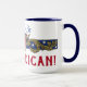 Put your patriotism where your mouth is with this gorgeously designed 15 oz. ceramic coffee mug featuring an ornate banner and shield with golden leaves, red and white stripes, and white on blue stars, sandwiched between the 2-line caption: "Proud To Be An American!". Captions can be personalized at no extra cost. Inside mug is royal blue (no stains!) w/ matching handle.