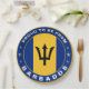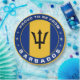 The national flag of Barbados is infused into a circle shape which itself, is colored in the flag colors. Along with decorative stars, there is the proud, patriotic text.