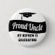 Show the world how proud you are of your nephew or nieces graduation. This proud Uncle button graphic art design includes a black graduation cap, black ribbon with the words "Proud Uncle" and the text My Nephew Is Graduating! . Bottom text can be changed to other personalization: My Niece Is Graduating!, So Proud of My Nephew, So Proud Of My Neice etc.. Great for all types of graduation ceremonies, parties and events. Perfect for kindergarten, middle school, high school, college, university, uni, grad school,, military academy, trade school, nursing school, law school, dental, school, medical school, and more. Show your pride!