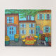Colourful, romantic painting scene of a beautiful Provence village and a table for two in the courtyard with a nice bottle of Rosé wine by Lisa Lorenz. Now available as a puzzle.