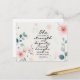 Inspirational quote scripture postcard depicts a beautiful floral design with pink flowers and blue leaves. It features Bible Verse Proverbs 31:25, "She is clothed in strength and dignity and she laughs without fear of the future."