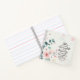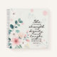 Inspirational quote scripture personalized notebook, journal depicts a beautiful floral design with pink flowers and blue leaves. It features Bible Verse Proverbs 31:25, "She is clothed with strength and dignity and she laughs without fear of the future." Customize the back with name or details of your choice._