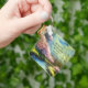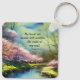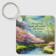 Inspirational quote scripture keychain depicts a beautiful nature watercolor painting with a quiet stream of water lined with pink flowering trees and a blue sky. It features a portion of the beloved and encouraging Bible Verse 'The Lord is my Shepherd', Psalm 23:2-3, "He leads me beside still waters, He restores my soul."