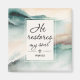 Inspirational scripture magnet depicts a simple watercolor abstract background in natural shades of blue, tan, black and brown. It features a portion of Bible Verse Psalm 23:4, "He restores my soul."