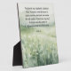 Bible verse art sign with stand features the first part of Psalm 23 printed above a beautiful green landscape scene. Home decor sign is a lovely way to display God's word in your home. Bible verse reads: "The Lord is my shepherd; I shall not want. He makes me to lie down in green pastures; He leads me beside the still waters. He restores my soul; He leads me in the paths of righteousness for His name’s sake." From Psalm 23. Sign makes a lovely wedding gift, housewarming gift, or all occasion gift for Christian friends.