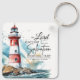 Keychain with inspirational quote scripture depicts a red and white lighthouse on a rocky ocean coastline. It features a powerful and encouraging Bible Verse Psalm 27:1, "The LORD is my light and my salvation; Whom shall I fear? The LORD is the strength of my life; Of whom shall I be afraid?"