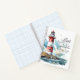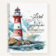 Notebook, journal with inspirational quote scripture depicts a red and white lighthouse on a rocky ocean coastline. It features a powerful and encouraging Bible Verse Psalm 27:1, "The LORD is my light and my salvation; Whom shall I fear? The LORD is the strength of my life; Of whom shall I be afraid?"