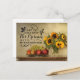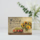 Inspirational quote Thanksgiving postcard depicts a beautiful still life with a vase of sunflowers and bowl of fruit. It features a portion of Bible Verse Psalm 95:2, "Let us come into his presence with thanksgiving."~