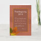 Religious Thanksgiving greeting card quotes Psalms 107:1 on a rust-coloured patterned background with an autumn leaf overlay. Change placeholder text to show current year and your name.