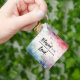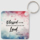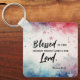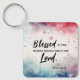 Keychain with inspirational quote scripture depicts an abstract red, white and blue design of the American Flag. It features Bible Verse Psalms 33:12, "Blessed is the nation whose God is the LORD."