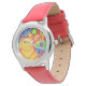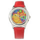 Groovy baby! A yellow and orange striped cat with swirling whiskers and a psychedelic rainbow patterned background. Watch with a yellow, orange, red, blue, green, pink, purple, and white customizable design for you to personalise with your own text, images and ideas. Available in all style options. Image created from an original digitally enhanced coloured pencil drawing.