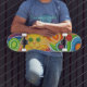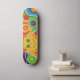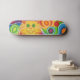 Groovy baby! A yellow and orange striped cat with swirling whiskers and a psychedelic rainbow patterned background. Skateboard with a yellow, orange, red, blue, green, pink, purple, and white customizable design for you to personalise with your own text, images and ideas. An original digitally enhanced coloured pencil drawing by Jess Perry.